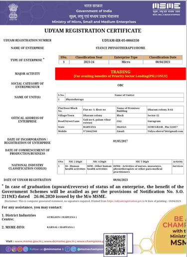 Stance Physiotherapy has been providing home services in Gurgaon since 2017. Their team of experienced and skilled physiotherapists offer a range of services such as post-operative rehabilitation, pain management, neurological rehabilitation, and sports injury management, among others. They focus on providing personalised and effective treatment plans to help patients regain their mobility and improve their overall quality of life. Stance Physiotherapy understands that it may not always be possible for patients to visit a clinic for their therapy sessions, which is why they offer their services in the comfort of the patient's own home. With their commitment to providing high-quality, convenient, and affordable services, Stance Physiotherapy has become a trusted name in Gurgaon's healthcare industry.
